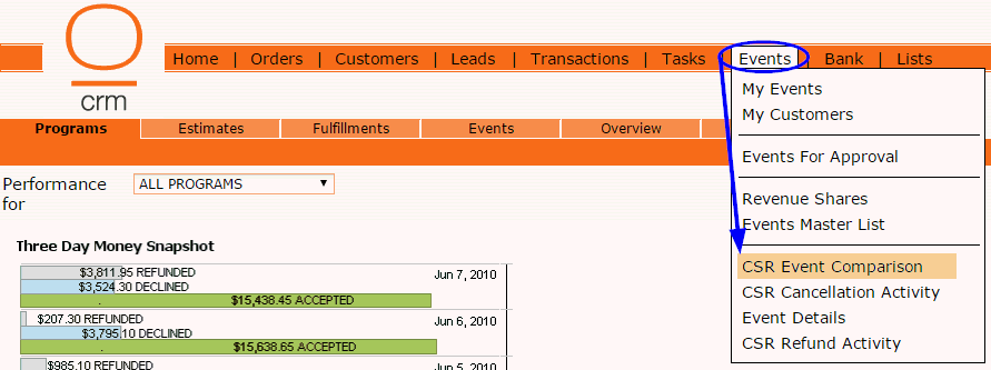 To run this report, go to the Events menu on the home page and click on CSR Event Comparison.