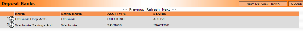 To see a list of all your current deposit banks, from the main navigation page of the CRM got the Banks menu and select Deposit Banks. A list will appear like the one below.
