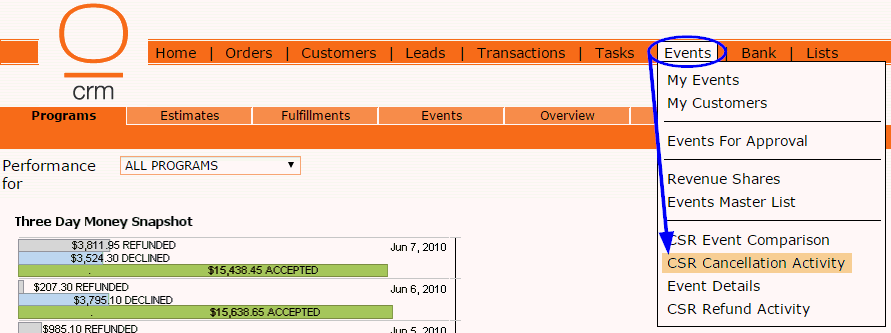 To run this report, go to the Events menu on the home page and click on CSR Cancellation Activity.