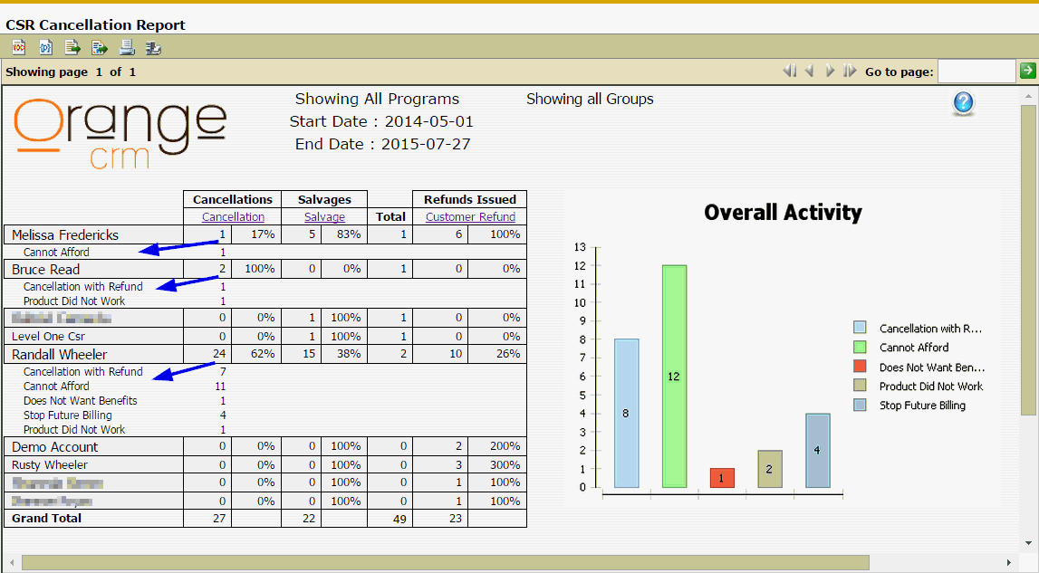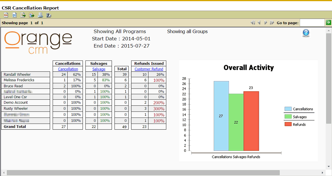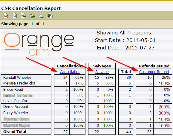 Starting from the Left, the first column displays the names of the CSRs who performed at least one Cancellation, Salvage or Refund within the specified date range.