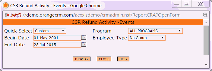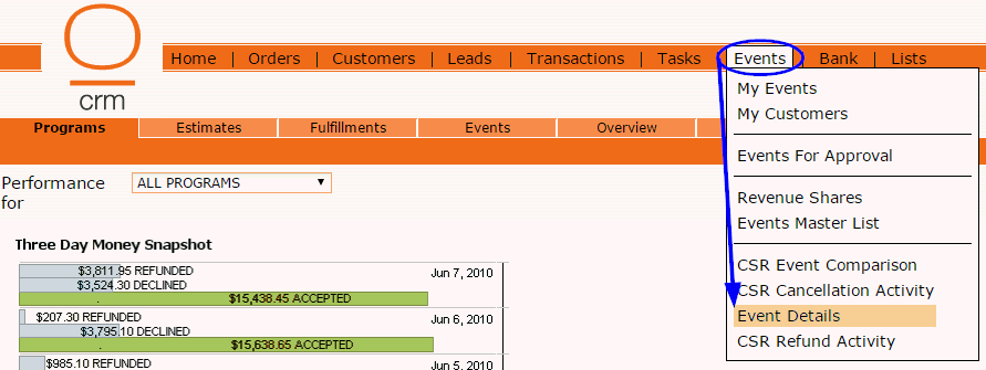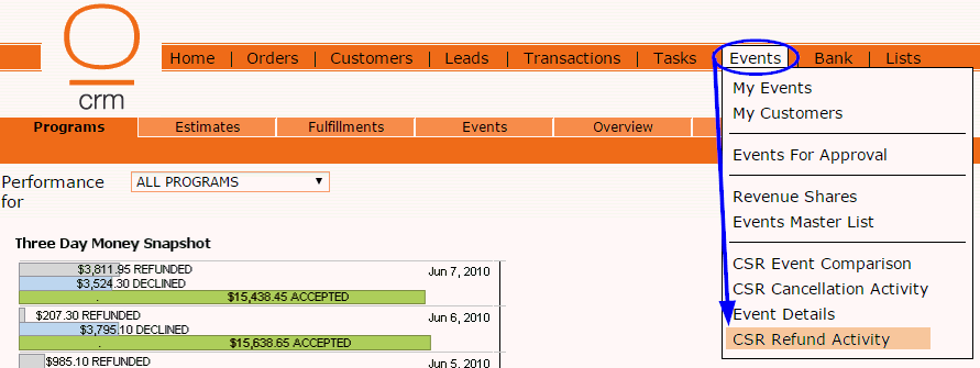 To run this report, go to the Events menu on the home page and click on CSR Refund Activity.