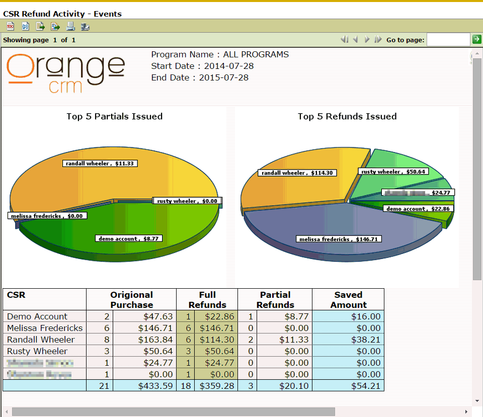 At the top of the report you will see 2 pie charts depicting the Top 5 Partial Refunds Issued and the Top 5 Full Refunds Issued. Each pie chart displays the names of the 5 CSRs with the highest dollar amount in partial/full refunds.