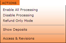 Depending on the users' access rights, the user may be able to perform the actions as noted above: show active fee schedules, show inactive fee schedules, show deposits, and show the access & revisions on this merchant bank.