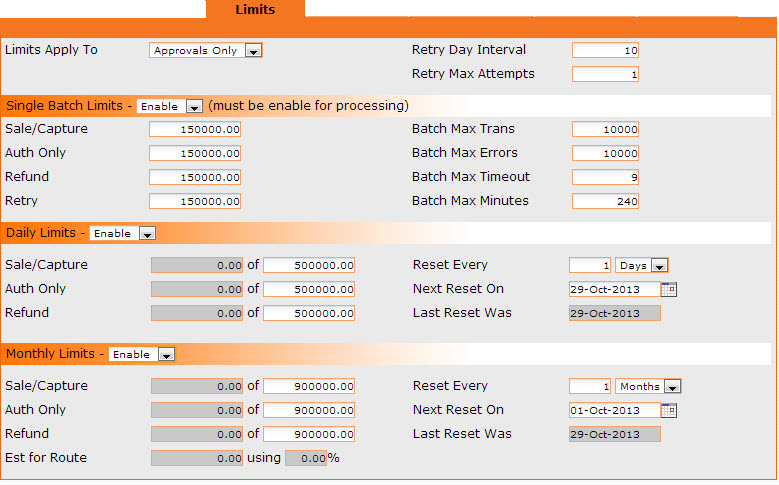 Monthly Limits drop down fields - Enter your monthly currency limits - can be either enabled or disabled. The gray fields below reports the amount you have captured, preauthorized, or refunded from your monthly limit.