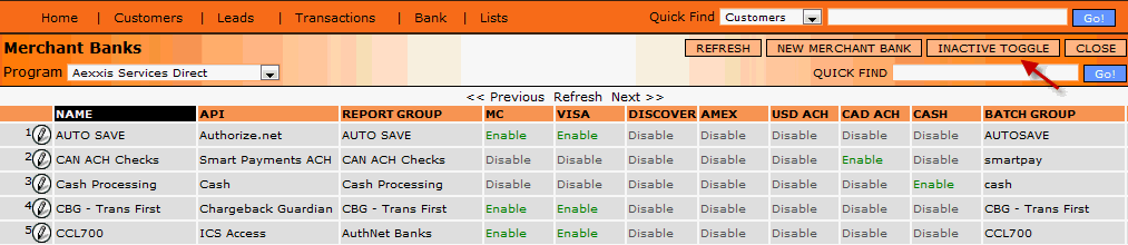 The Inactive Toggle located on the right side on the main Merchant Banks form (as shown below) lists the inactive merchant banks with their payment sources set to disable.